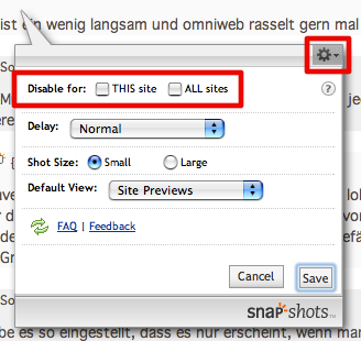 Ich habe gerade herausgefunden, dass man Snap Shots ganz einfach deaktivieren kann. Man muss einfach, wenn es eingeblendet wird auf das Zahnrad klicken und dann kann man unter “Disable” entweder einstellen, dass es bei mir nicht angezeigt wird (THIS site) oder allgemein auf keiner Seite (ALL sites). Danach muss man nur noch auf Save klicken und es sollt verschwinden….