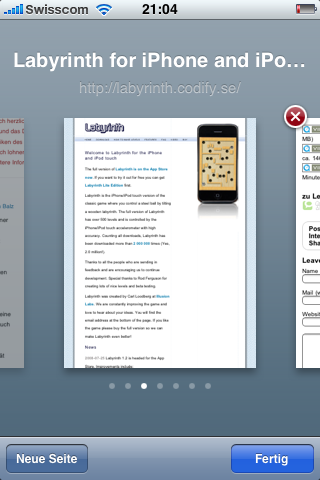 Links: Fehler in MobileSafari. Der Schliessenknopf fehlt.