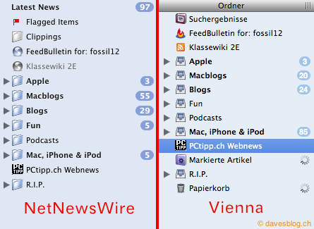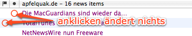 Ein nettes Feature bei Vienna ist, dass man Artikel mit einem Klick in die Richtige Kolonne wieder als Ungelesen oder als Markiert markieren kann. Das geht bei NNW leider nicht, man muss sich stattdessen per Tastenkombination, Menü oder Rechtsklick dieser Option bedienen.